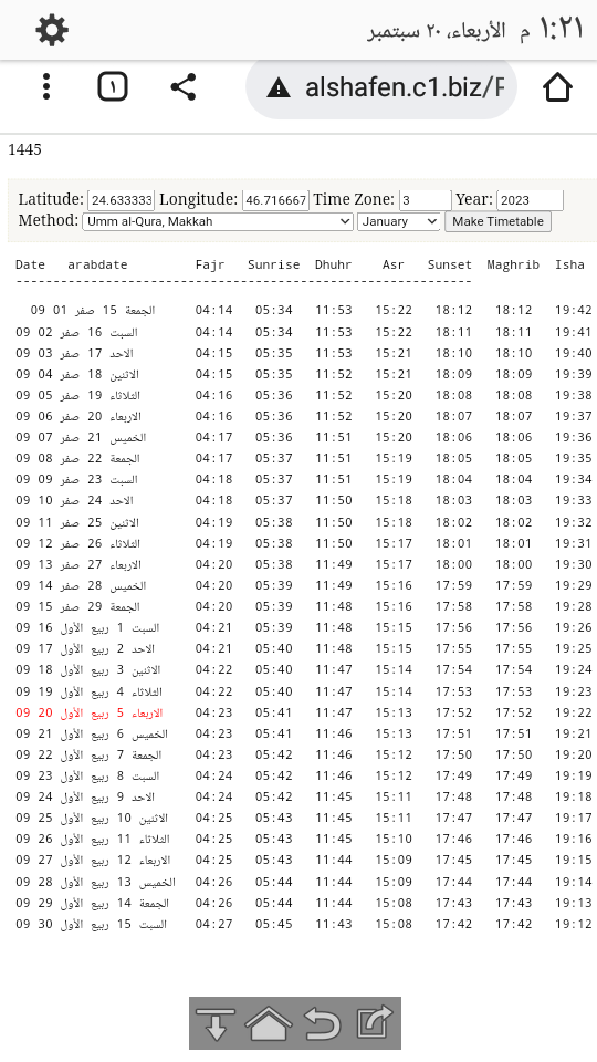التاريخ الهجري واوقات الصلاة الشهري