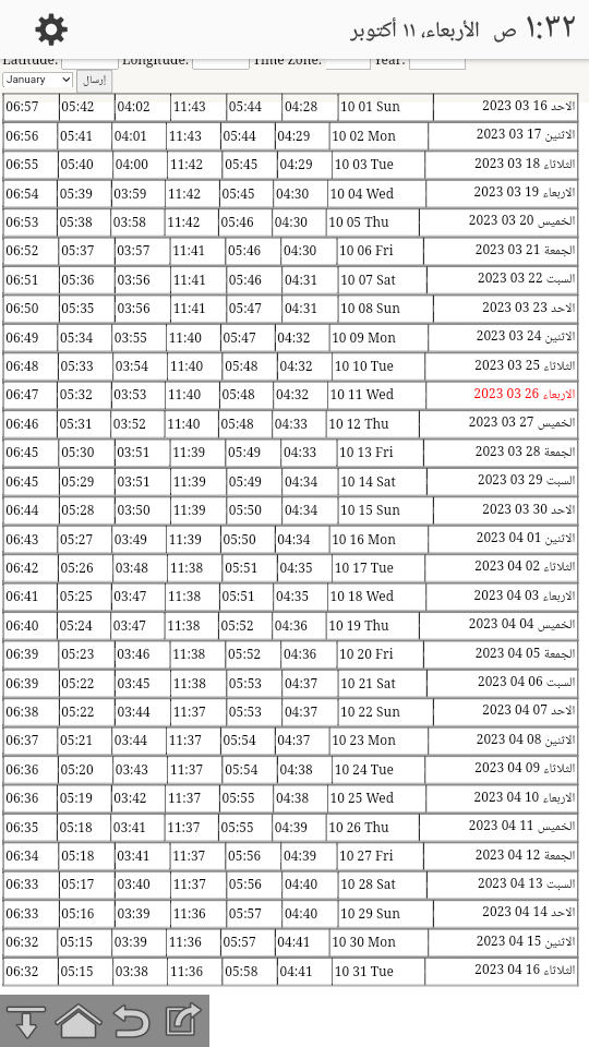 اوقات الصلاة تبداء بعد التاريخ الهجري من اليمين لليسار الفجر-الشروق-الظهر-العصر-المغرب-العشاء