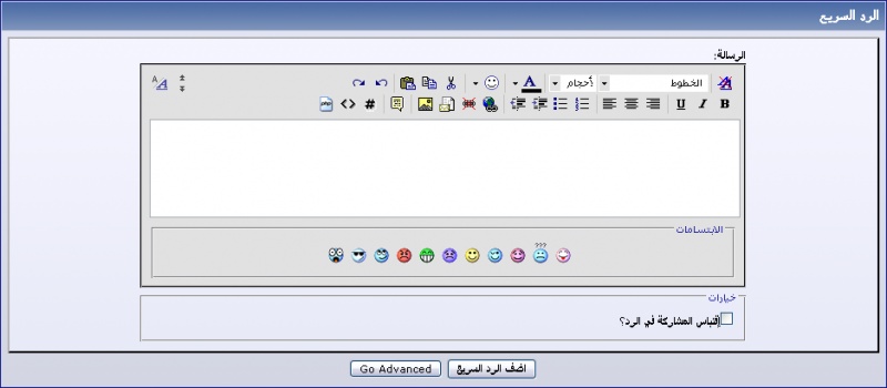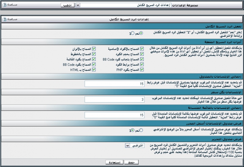 التحكم بالبرمجية:- لوحة تحكم الإدارة -> خيارات المنتدى -> إعدادات الرد السريع الكامل