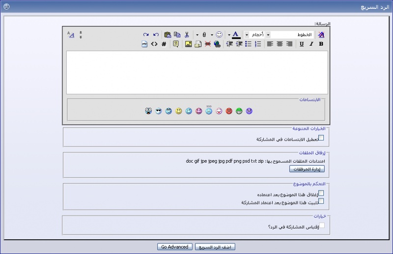 - هذا المنتج يقوم بإضافة أغلب مزايا وخواص الرد المتقدم -إن لم تكن كل- للرد السريع [ صندوق الوجوه التعبيرية / قائمة الوجوه التعبيرية / كافة أزرار وأدوات التنسيق المتاحة / المرفقات / أدوات التحكم بالموضوع ]