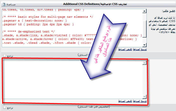 و نكتب التالي في هذا المكان من تعاريف CSS الإضافية/Additional CSS Definitions