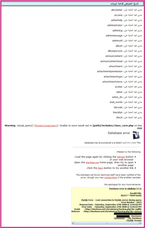 الموضحة بالصورةكود:Database error in vBulletin 3.7.2: Invalid SQL: SELECT * FROM book; MySQL Error : Lost connection to MySQL server during query Error Number : 2013 Request Date : Saturday, September 27th 2008 @ 11:13:39 PM Error Date : Saturday, September 27th 2008 @ 11:13:40 PM Script : http://sherbeen.net/vb/admincp/backup.php?do=sqlfile Referrer : http://sherbeen.net/vb/admincp/backup.php?do=choose