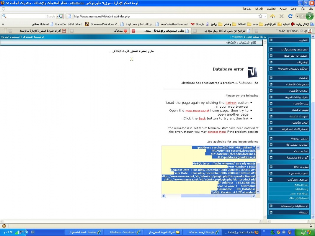 Database error The منتديات الماسة نت database has encountered a problem. Please try the following:The www.masssa.net forum technical staff have been notified of the error, though you may contact them if the problem persists.