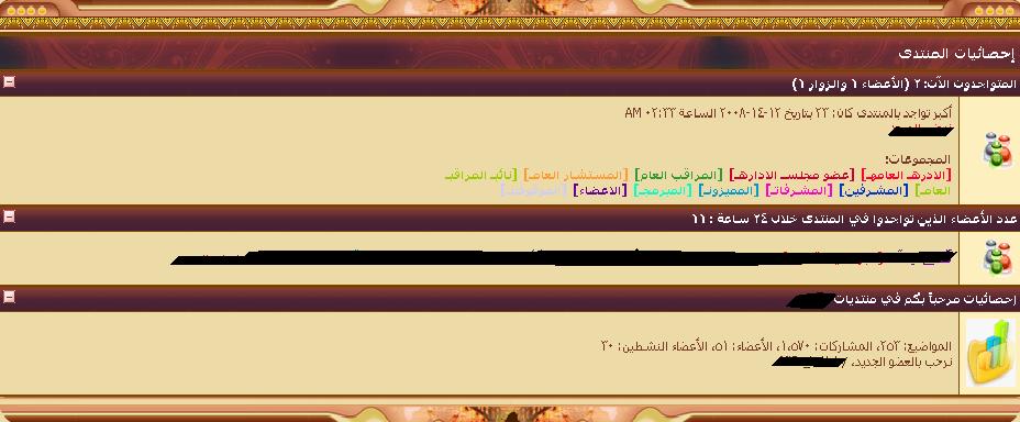 ركبت احصائات المنتدى وهاك ضهور المجموعات لكن تسنيق الكتابه يضهر في الجهه اليمنى للجدول ويضهر بشكل غير مرتب ياليت اشوف حل عندكم :(