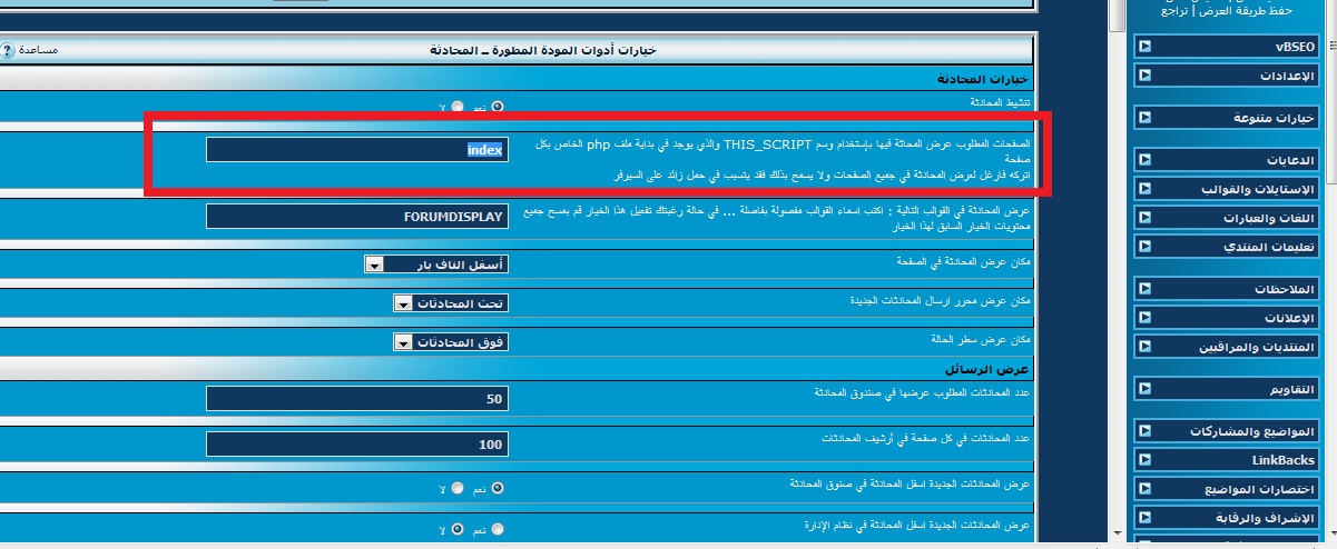 السلام عليكم أبغى أنقل صندوق المحادثة إلى قسم معين بدلا من الرئيسية مثلا المنتدى النسائي هذا الخيار متاح في أدوات المودة للمحادثة بس ما عرفت وش أكتب بدال index الله لا يهينكم اللي يعرف لا يبخل علي أنا لي اسبوع وأنا أحاول وأدور في قوقل ماعرفت
