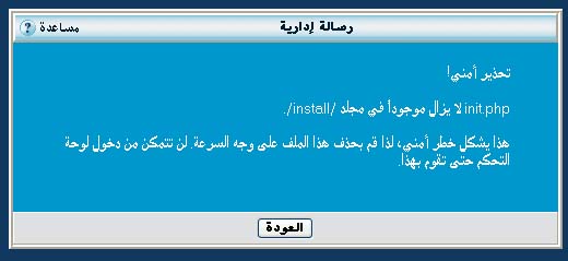 اخوي ابو راشد ركبت النسخة الماسية لأخونا الدرابيل ويوم ادخل على لوحة التحكم يظهر هذا الخطا الي في صوره لازم احدف ملف init.php الي في مجلد install فما الحل اخي ابو راشد مع اني حاولت اضيف ملف ثاني من نسخ اخرى ولكن نفس المشكله